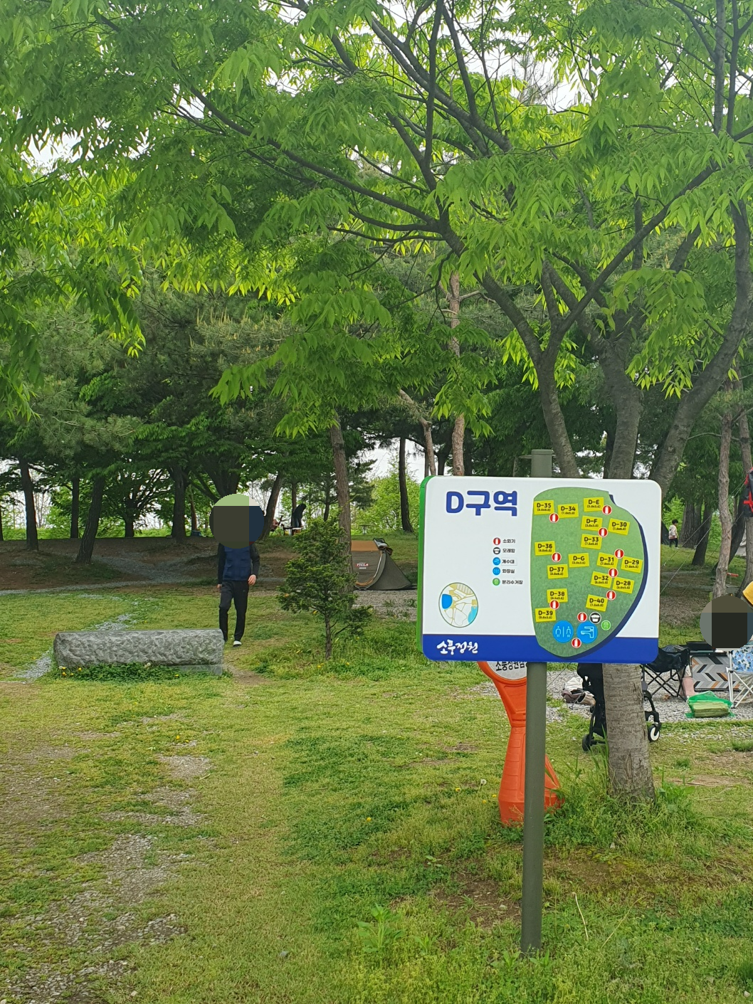 위 두번째 사진은 놀이터 쪽에서 A구역을 바라본 모습이에요 저 오른쪽 상단 나무들 아래가 A구역 입니다. A구역은 멋진 소나무로 둘러 쌓여 있어서 그늘막이나 타프를 치지 않아도 그늘이 있어 좋습니다. 하지만 사이트끼리의 간격이 좀 좁고 붙어 있는 느낌이 있습니다. A구역은 타 캠핑장 보다도 사이트가 좀더 좁은 느낌이네요^^