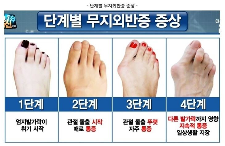 무지외반증 단계별 증상입니다. 4단계에 이르면 일상생활에 지장을 주는 수준이 3되며 1단계 또는 2단계 초기에 적극적인 치료와 관리를 해주어 더 진행 시키지 않는 것이 매우 중요합니다.