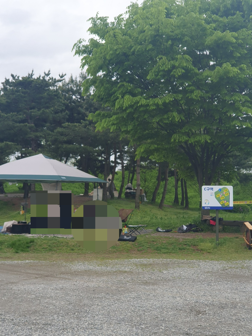 위 두번째 사진은 놀이터 쪽에서 A구역을 바라본 모습이에요 저 오른쪽 상단 나무들 아래가 A구역 입니다. A구역은 멋진 소나무로 둘러 쌓여 있어서 그늘막이나 타프를 치지 않아도 그늘이 있어 좋습니다. 하지만 사이트끼리의 간격이 좀 좁고 붙어 있는 느낌이 있습니다. A구역은 타 캠핑장 보다도 사이트가 좀더 좁은 느낌이네요^^